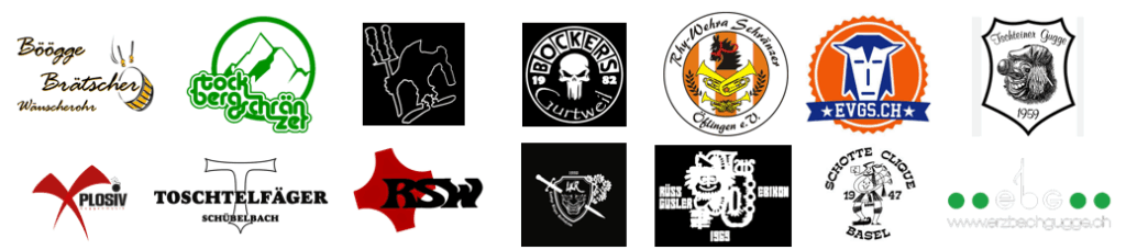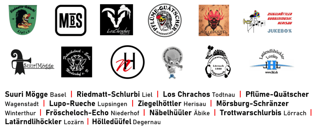 BÖÖGGE BRÄTSCHER Welschenrohr (CH) | STOCKBERGSCHRÄNZER Siebnen (CH) | CHAPPELGNOME Luzern (CH) | ECHO VOM GRUNDGÄSSLI Siebnen (CH) | RHY-WEHRA SCHRÄNZER Öflingen (DE) | TOSCHTELFÄGER Schübelbach (CH) | RÄBESCHLÄCKER Wettingen (CH) | RÜSSGUSLER Ebikon (CH) | SCHOTTE CLIQUE 1947 Basel (CH) | BOCKERS Gurtweil (DE) | XPLOSIV Singen (DE) | ERZBACHGUGGE Speuz (CH) | LUSTIGE KLIQUE Riedisheim (FR) | ISCHTEINER GUGGE Istein (DE)