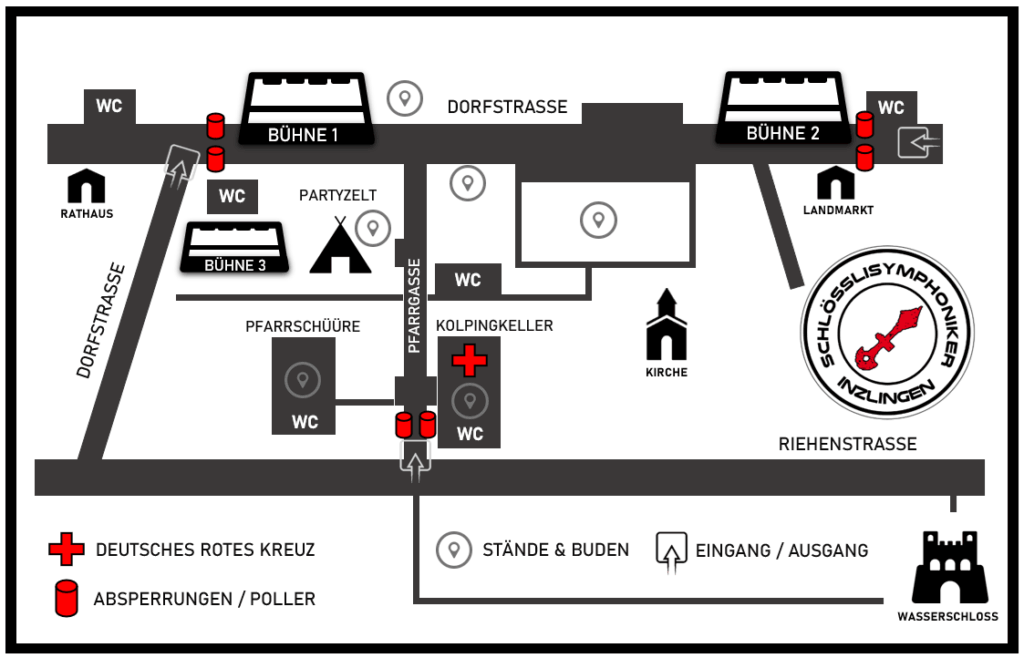 Das Festgelände ist per Dorfstrasse aus Richtung •altes Rathaus und •Landmarkt, sowie durch die Pfarrgasse kommend erreichbar